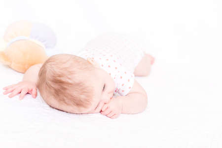Baby sleeping on her tummy. Naptime in child scheldue. Copy space