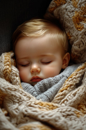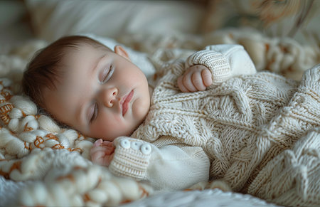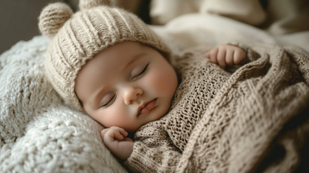 A baby is peacefully sleeping in a cozy sweater, curled up in a soft blanket. Gentle light from the background creates a calm atmosphere, perfect for rest.