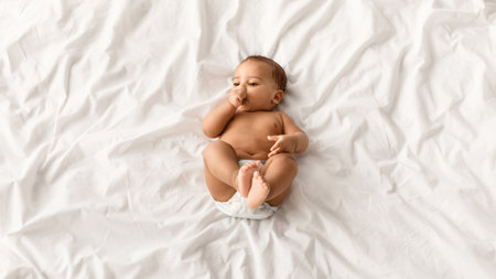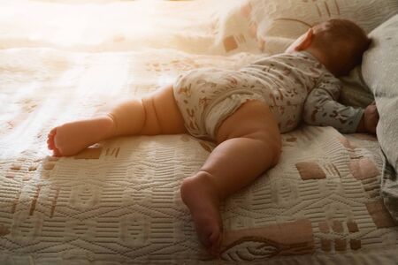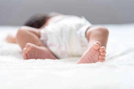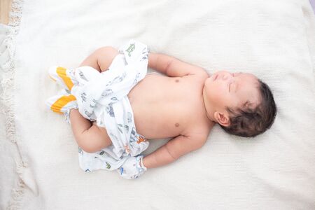Newborn baby belly and legs in diaper, lying on white bed, top view, copy space. Newborn