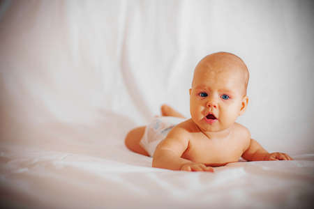 A beautiful 6 month old baby with big eyes lies on the bed.