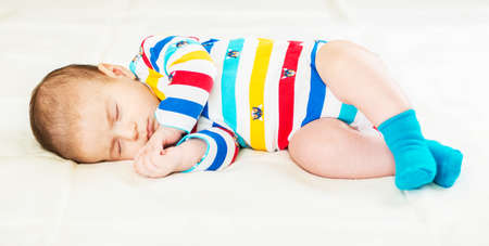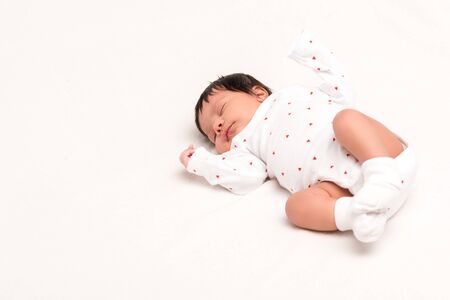 cute bi-racial newborn in baby romper and socks sleeping on white