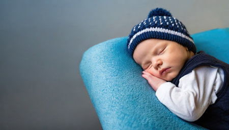 Capture the essence of the image by describing a newborn baby with a knitted cap sleeping peacefully on a soft blue pillow. This heartwarming scene embodies the concept of children's sleep, with ample space on the left for text. Perfect for various creative projects.