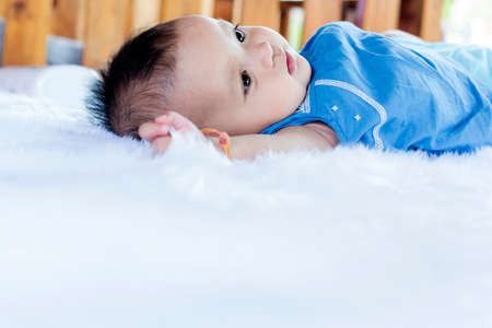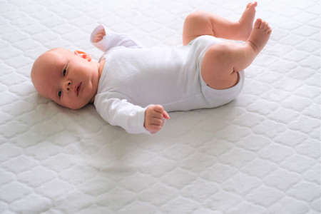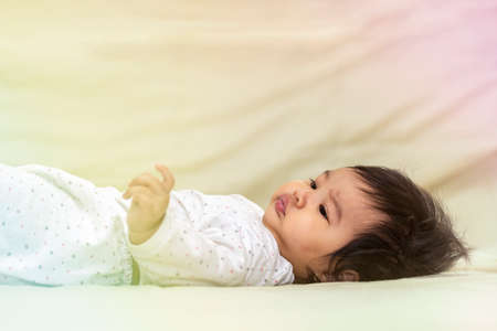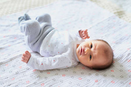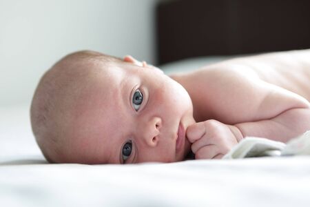 portrait of a pretty newborn baby lying on the bed. photo with copy space