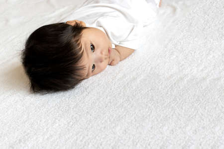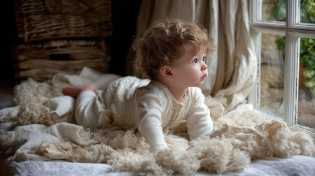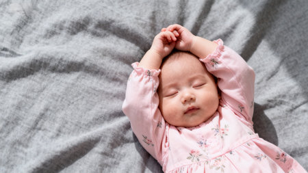 Sweet baby peacefully lying on a soft white blanket, joyfully raising tiny arms. Innocent and pure, embodying childhood essence