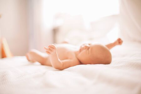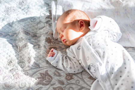 Cute newborn baby girl sleeping on bed at home. Happy childhood.