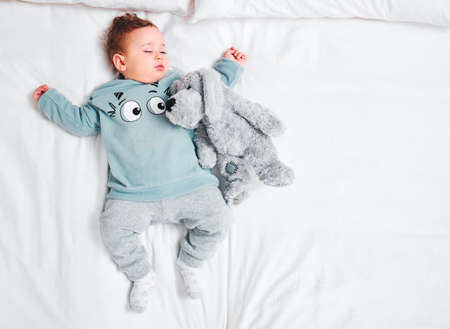 Cute infant baby boy sleeping on white blanket with teddy doll