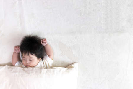 Upper view photo of a newborn baby sleeping well in bed near free space
