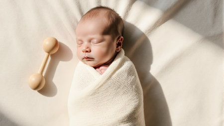 A peaceful newborn rests soundly, wrapped in a soft blanket, while warm golden light creates a tranquil ambiance around.
