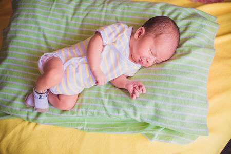 newborn baby boy, wearing yellow clothes, sleeping on a soft mattress