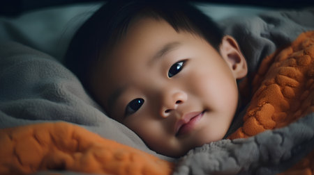 toddler sleeping soundly, wrapped in cozy blanket. Asian baby in warm bed, watercolor illustration