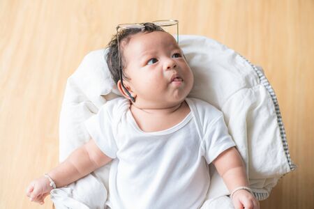 Cute newborn baby girl in white blanket on nursery bed. Adorable newborn child, little boy eyes look people Family, new childhood, infant soft skin portrait concept. Jaundice syndrome life hospital.
