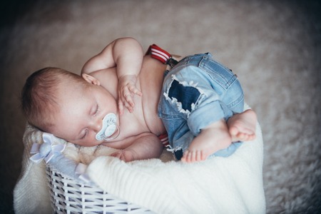 Newborn baby in jeans sleep in basket on floor. Child with pacifier asleep in crib. Childhood, infancy, innocence. Sweet dream concept. Nap, relax, tranquility.