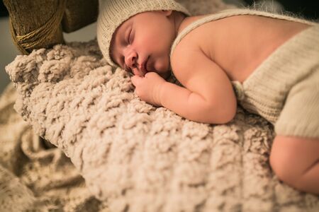 Cute little newborn baby in a knitted suit lies on a soft plaid and smiles in a dream. The concept of advertising children's goods and services