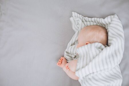 Portrait of baby in sleepwear lying under gray blanket on bed at home. Sleeping on back infant child in bedroom, see sweet dream. Grey background, free copy space. Childcare and healthy sleep concept