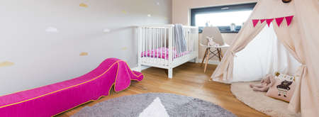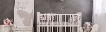 Modern baby room interior with white crib and pink armchair against grey, empty wall