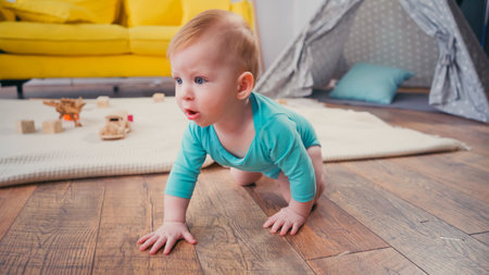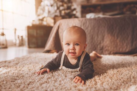 Southeast Asian new born is creeping on the floor. Newborn is wearing gray shirt. Baby is South East Asian. Kid is cute. Child is taking photo indoor. Infant is 4 months. - People, Health care concept