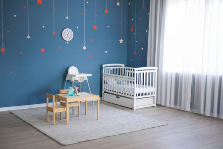 Interior of white room with baby crib and armchair near window with blue chest of drawers in daylight