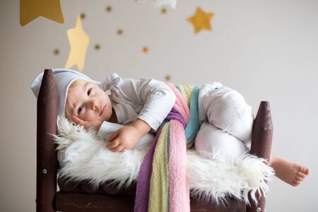 Cute child, blonde boy, playing at night with colorful scarf and teddy bear