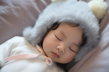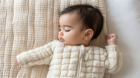 A charming image of a sleeping baby in a cozy cream outfit, resting peacefully on a soft bedspread. The scene captures tranquility and warmth.