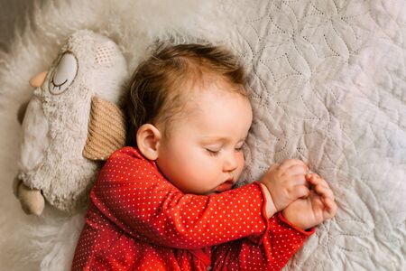 Baby sleeps on bed. Infant development concept, toddler restful sleep, teething, colic.