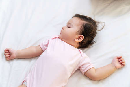 Little baby girl wearing pink cloth sleeping on white bed at home. Adorable one year old toddler mixed race asleep having good dream resting in the bedroom.