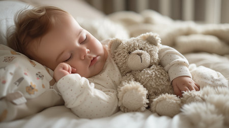 A baby with curly hair rests soundly beside a teddy bear in a plush and calming nursery. Soft blankets surround them, creating a warm and serene environment.