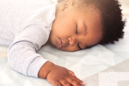 Closeup cute toddler baby sleeping on a cozy bed. Happy toddler child peaceful sleep on a comfortable bed at home. Sweet dreams. Adorable toddler naptime. Family love and tranquility.