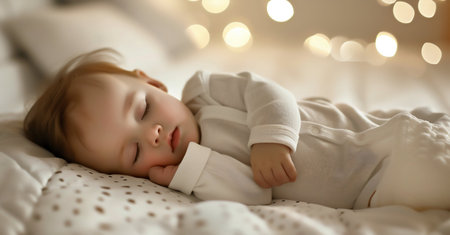 A serene baby sleeping soundly, wrapped in a cozy blanket, bathed in soft, warm light, creating a peaceful atmosphere.
