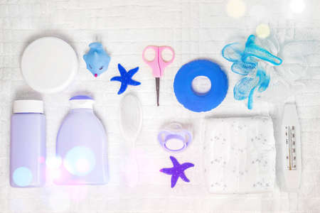 Set of clothing and body care supplies for newborns. Collect the bag in the maternity hospital. Accessories for baby care. Top view