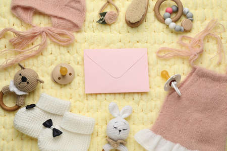 baby shower party. Envelope surrounded by stuff for child on yellow knitted fabric, flat lay