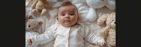 Portrait of wonderful baby girl laying on comfortable bed at home, adorable cute toddler look around with big interest, smiling, childhood and childcare concept. high quality photo