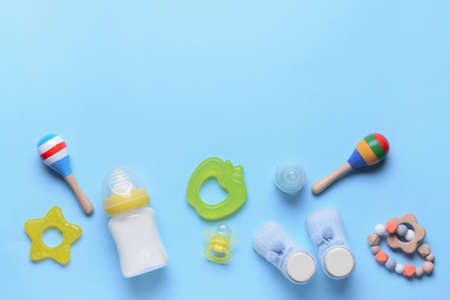 Cute baby accessories on blue background . Copy space Top view Flat lay.