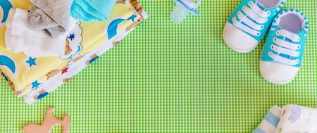 A set of things for a small child on a colored background of the copy space. Baby diapers, knitted baby shoes and a pacifier on a light background and the inscription happy baby