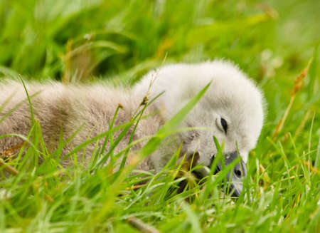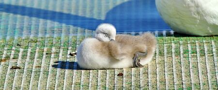 A very small and fluffy little swan, just slipped, newborn, rests and sleeps at the banks of a lake. Very cute and awesome.