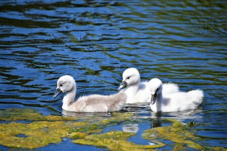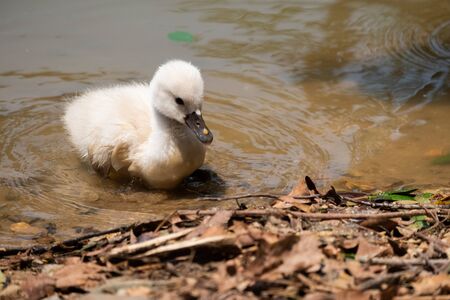 chicks of a white swan playing the pond water close up selective focus blur background