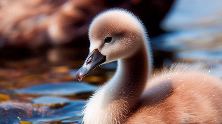 A young swan chick glides across the surface of a serene pond, surrounded by soft morning light and reflections, showcasing its fluffy feathers and curious demeanor.