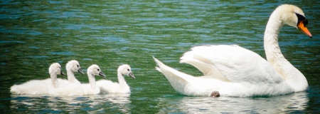 Mute swan, Cygnus olor, swimming with her chicks in the sea lagoon.
