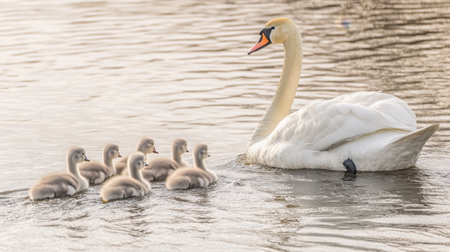 Swan family, mother with her chicks, swimming on the river Moselle in Germany, water birds