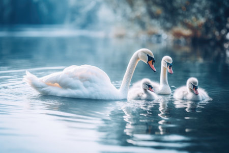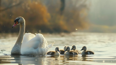 Tranquil Scene of a Swan Family Swimming on a Lake at autumn time.