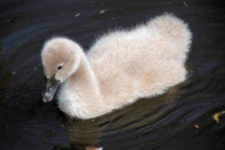 Baby swan or cygnet swimming in pond with water drops on feathers closeup