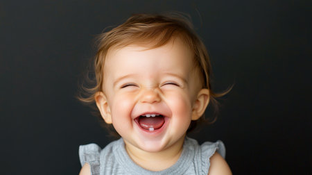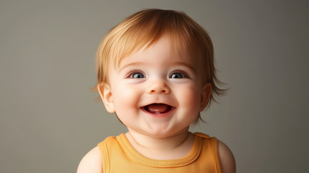 This delightful image features a joyful baby with sparkling blue eyes and a bright smile, set against a soft gray background, representing pure happiness.