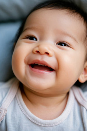 Close-up of a joyful baby with bright blue eyes and a wide smile, capturing the essence of innocence and happiness in a cozy, soft setting.