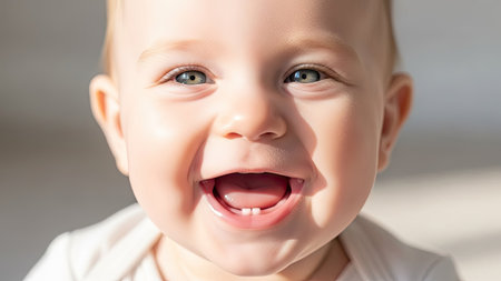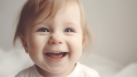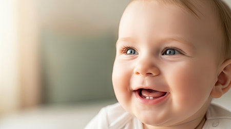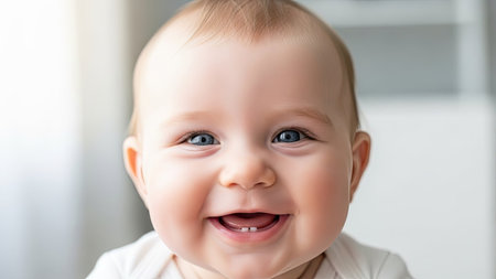 A close-up captures a smiling baby with a clear, soft complexion and bright blue eyes. The composition highlights the child's joyful expression, enhanced by the soft lighting. The image suggests a clean indoor environment. Suitable for a range of commercial applications focused on infancy and happiness.