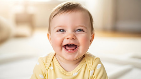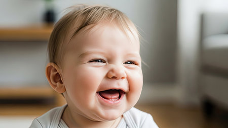 A close-up view presents a joyful baby with an open-mouthed smile. The child's fair skin and light hair are complemented by soft indoor lighting. This image could be used for various commercial or editorial purposes, conveying themes of happiness and childhood, without reference to specific brands or locations.