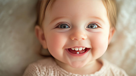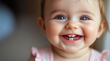 A charming baby girl with a radiant smile, showcasing her adorable teeth. The setting highlights warmth and innocence, perfect for family-oriented themes.