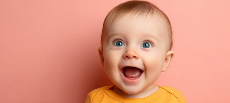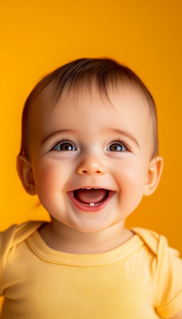 Joyful baby boy laughs happily on a bright yellow background, radiating innocence and cuteness, capturing childhood bliss with a heartwarming smile