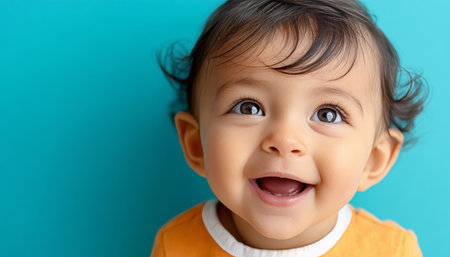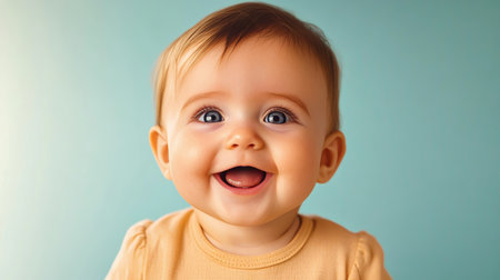 Adorable Baby Smiling Joyfully in a Teal Background, Capturing Innocence and Pure Happiness Moments