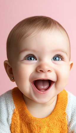 Adorable Infant Joyfully Grinning at Camera in Heartwarming Studio Portrait with Vibrant Background