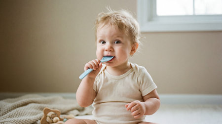 Curly haired baby sitting indoors and chewing on spoon with curious expression in soft natural morning light.