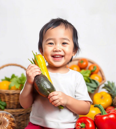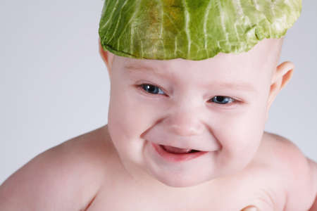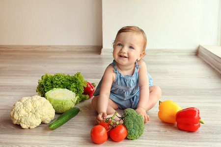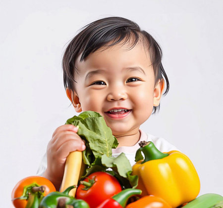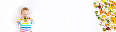 Cute baby and vegetable mix - broccoli, zucchini, carrots and cauliflower on white backround.
